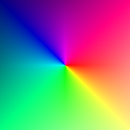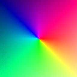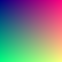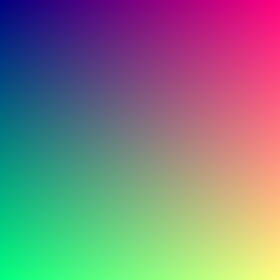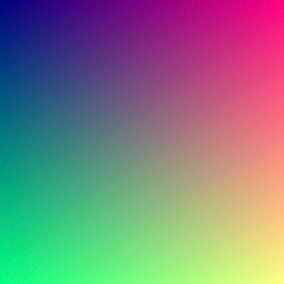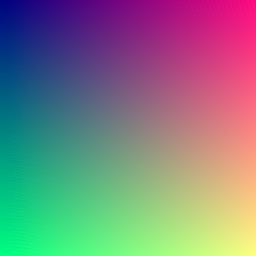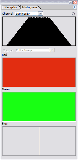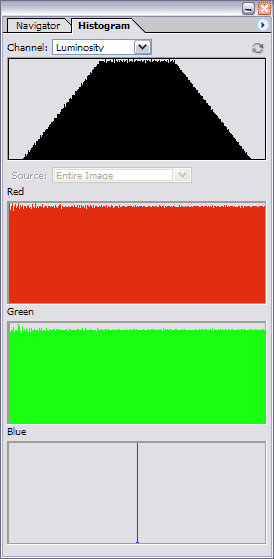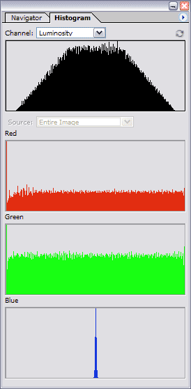 Links ist das Testbild. Es wurde in sRGB (8bit) erstellt und hat im Rot- und Grün-Kanal zwei perfekte Verläufe (Glättung 0, ohne Dither) von Schwarz nach Weiß. Der Blau-Kanal wurde mit 50% Grau gefüllt. Das kann man auch schön am Histogramm sehen: Rot- und Grün-Kanal sind komplett gefüllt, d.h. jeder der 256 Tonwerte kommt gleich häufig im Bild vor, und der Blau-Kanal besteht aus nur einem einzigen Tonwert. |