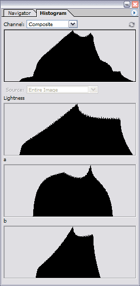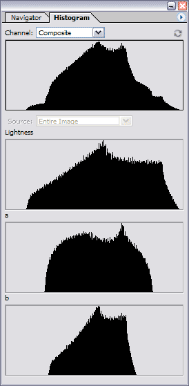 Es hat sich offenbar nichts geändert, das Bild sieht genau so weich und glatt aus, wie oben. Aber das Histogramm zeigt, daß hier deutlich gekürzt wurde: Ist oben noch in zwei Kanälen der gesamte Bereich von 0 bis 255 ausgefüllt, so haben hier die Verteilungen einen gehörigen Abstand zum Rand. Auch wenn der B-Kanal gefüllter wäre, im a- und b-Kanal von Lab drängelt sich immer alles wie ein Haufen Pinguine um die Mitte. |